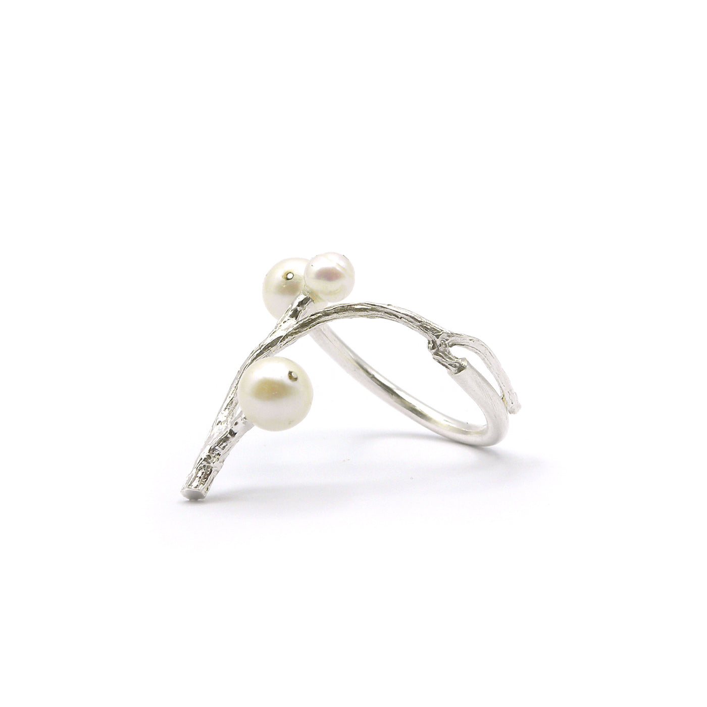 Anello in argento con rametto iperrealistico e perle coltivate in acqua dolce 6-6 e 1/2 mm