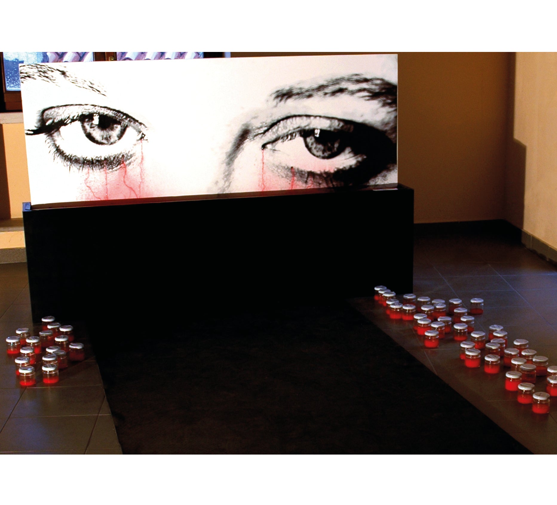 Simona Materi relaunches the sense of time in which the sacred apparitions no longer need to manifest themselves in the emblem of their bodily forms, but present signs, such as the simple cry constituted with tears of blood that tells the synthetic consistency of the contextuality to which all of us living belong and in which the artist is represented with the disposed jars of color in the symbolism of the double sense of red waxes and of the direct connection with tears of blood as an indication of an inner suffering equal to the pain felt by the deities for human greed: "infinity here has seen the spiritual lives one by one, pleads to you, by grace, of virtues so much, that it can rise higher with its eyes towards the last health.