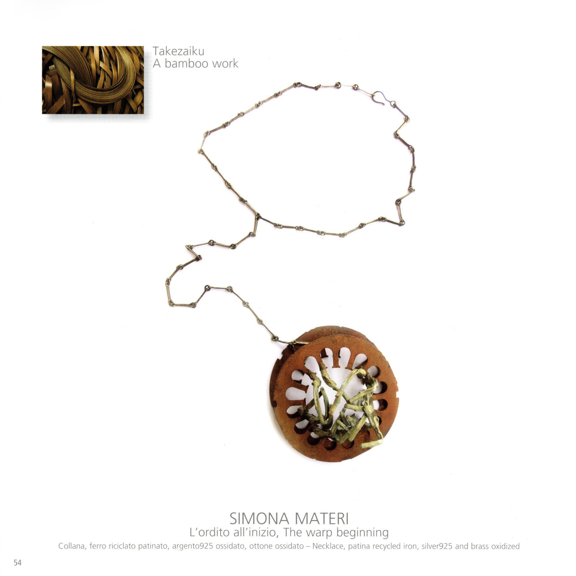 The project, promoted and curated by AGC Italy and JJDA Japan, associations that promote and disseminate the cultural value of contemporary jewelry, called DIALOGUES , , was born from the desire to celebrate 150 years of institutional relations between Italy and Japan. In the principle of exchange of suggestions between the selected artists, related to their countries of origin, thanks to the constant and thick dialogue with Chisa Takagi, my interest was captured by the work of the famous Japanese artist Takezaiku who works the bamboo in large sizes intertwining it and generating monumental aesthetic technical experiences of amazing beauty.