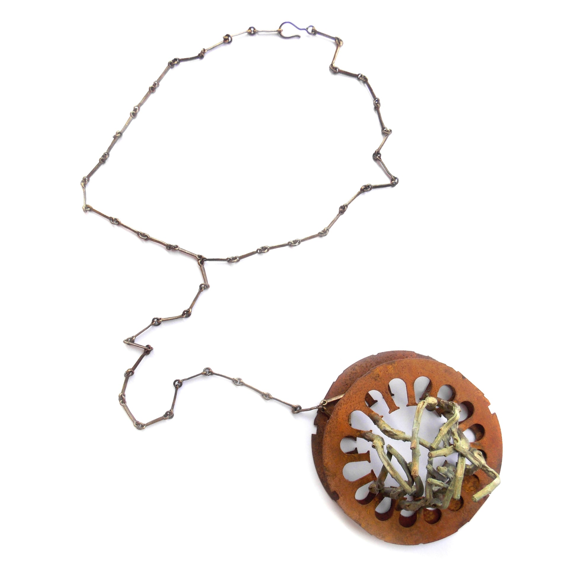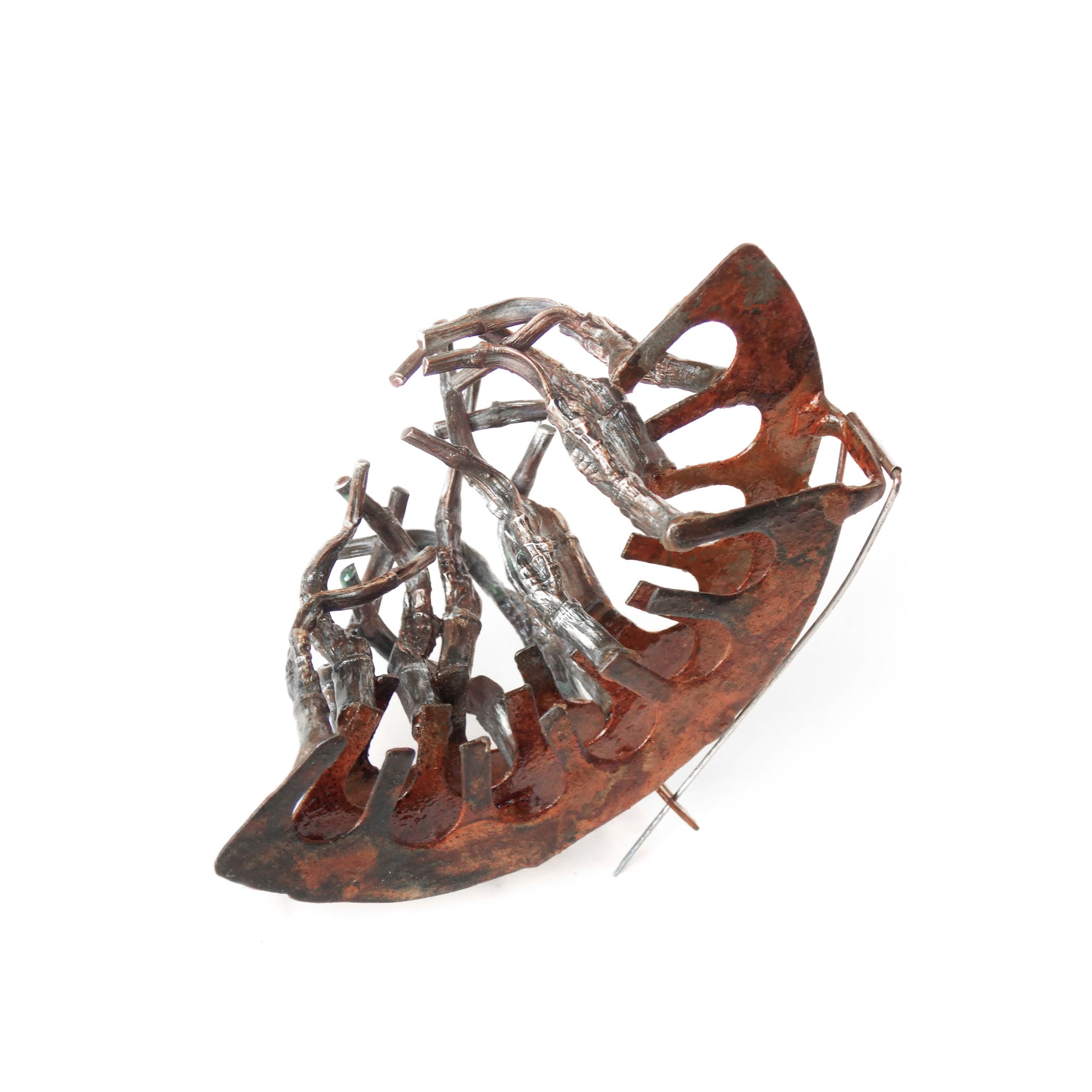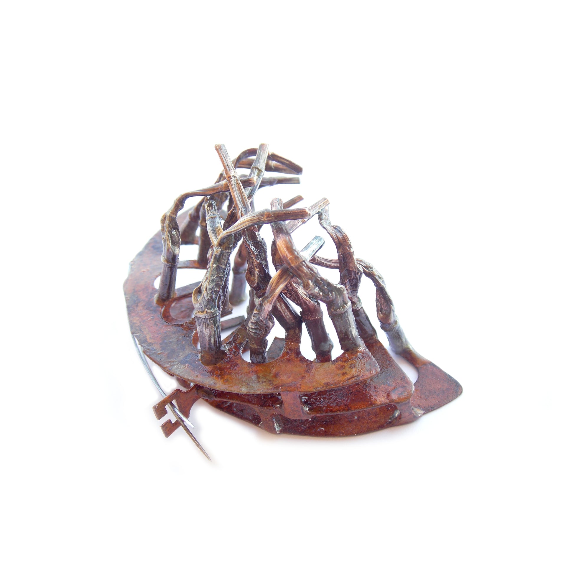 I reinterpreted the gesture of the weave, mentioning it with my materials, seeking with them the color of bamboo in its different shades, through experimental forms of oxidation, for the realization of the two pieces, a brooch and a pendant with a chain of discreet dimensions.