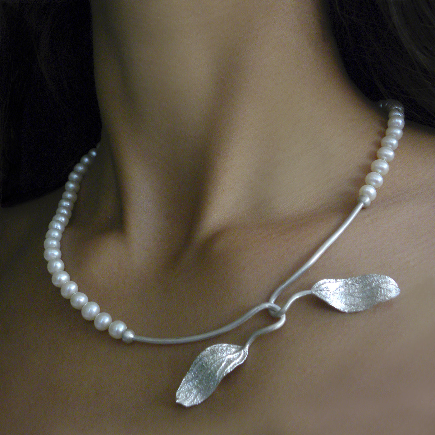 Necklace with freshwater cultured pearls 7 and 1/2 - 8 mm with silver long stem hook clasp and hyper-realistic bush leaves.